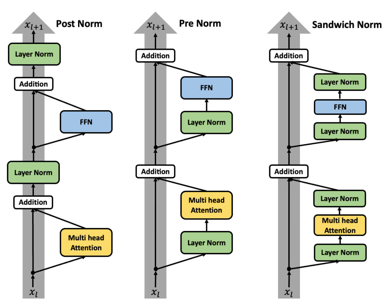 - Sandwich Norm:结合了Pre Norm和Post